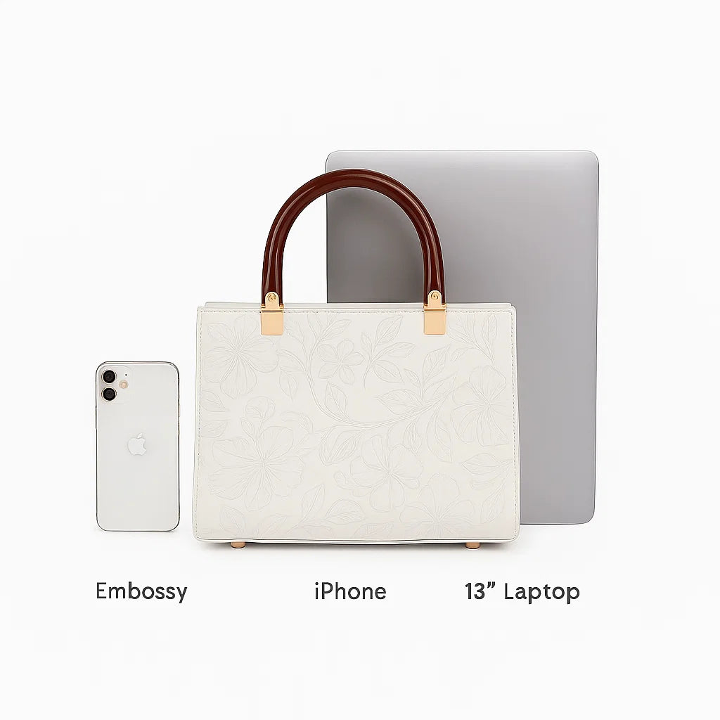 Introducing the Embossy – a floral-inspired statement bag crafted for women who love elegance with function. With its embossed design, structured silhouette, and golden accents, this satchel is made to turn every occasion into a style moment.
