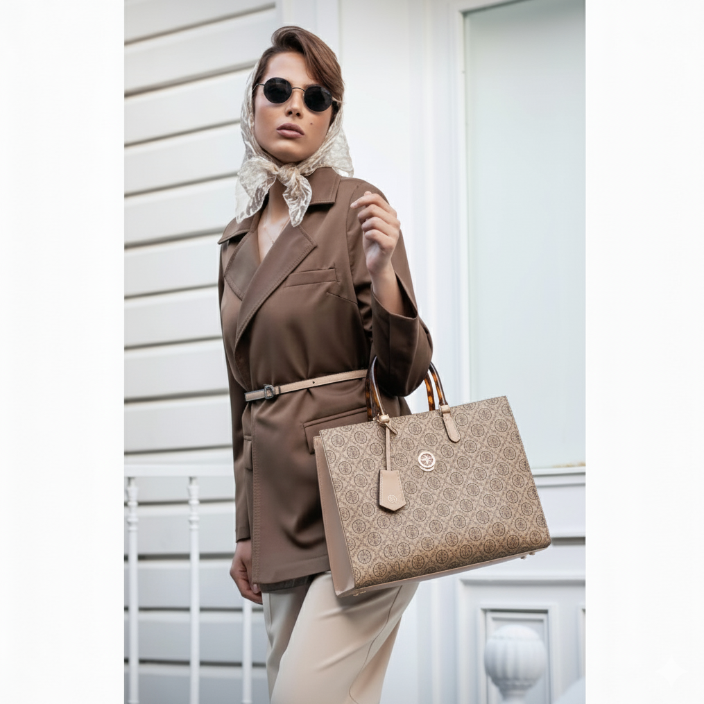 A statement piece for every occasion — the Évora Tote blends elegance with everyday functionality. Crafted with our signature monogram pattern and gold emblem detail, it offers a timeless look that complements any outfit. The spacious interior comes with a secure zipper closure, an inside pocket for your essentials, and a detachable long strap for versatile styling.