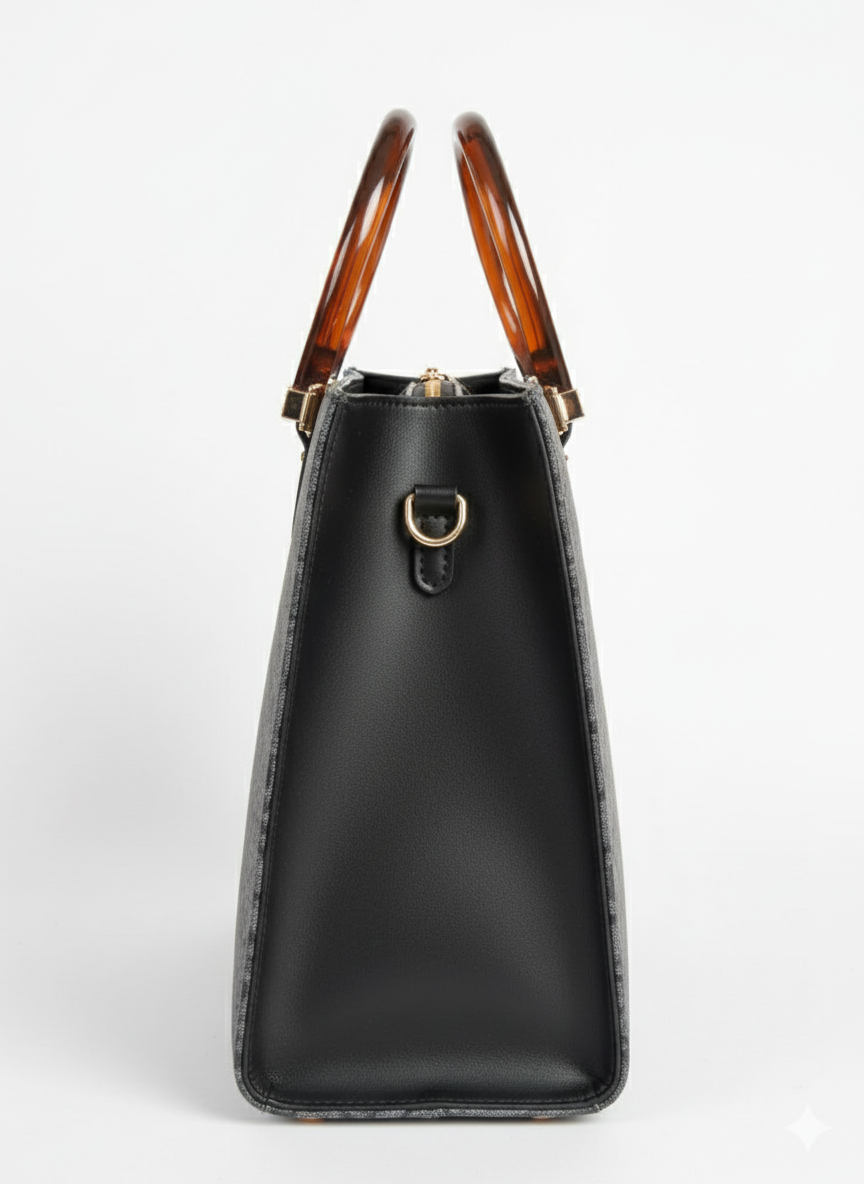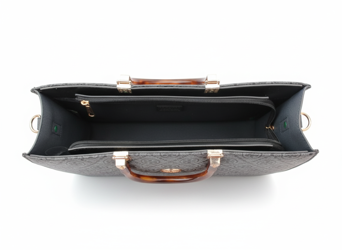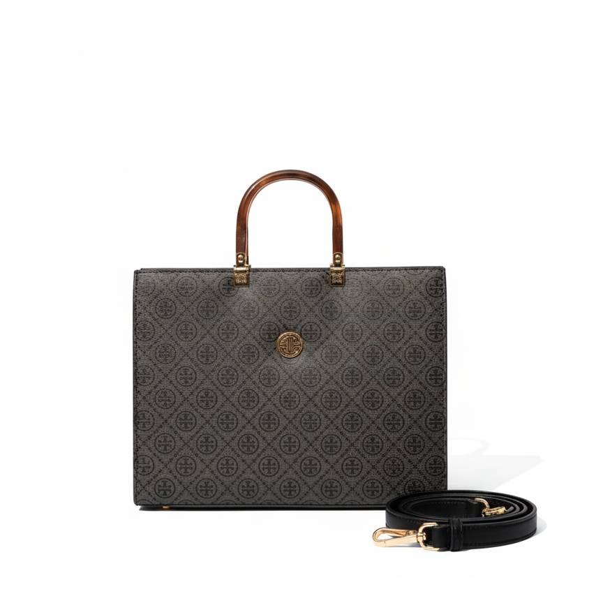 A statement piece for every occasion — the Évora Tote blends elegance with everyday functionality. Crafted with our signature monogram pattern and gold emblem detail, it offers a timeless look that complements any outfit. The spacious interior comes with a secure zipper closure, an inside pocket for your essentials, and a detachable long strap for versatile styling.