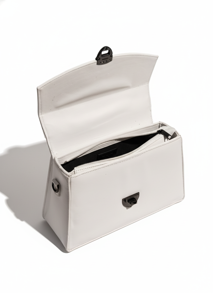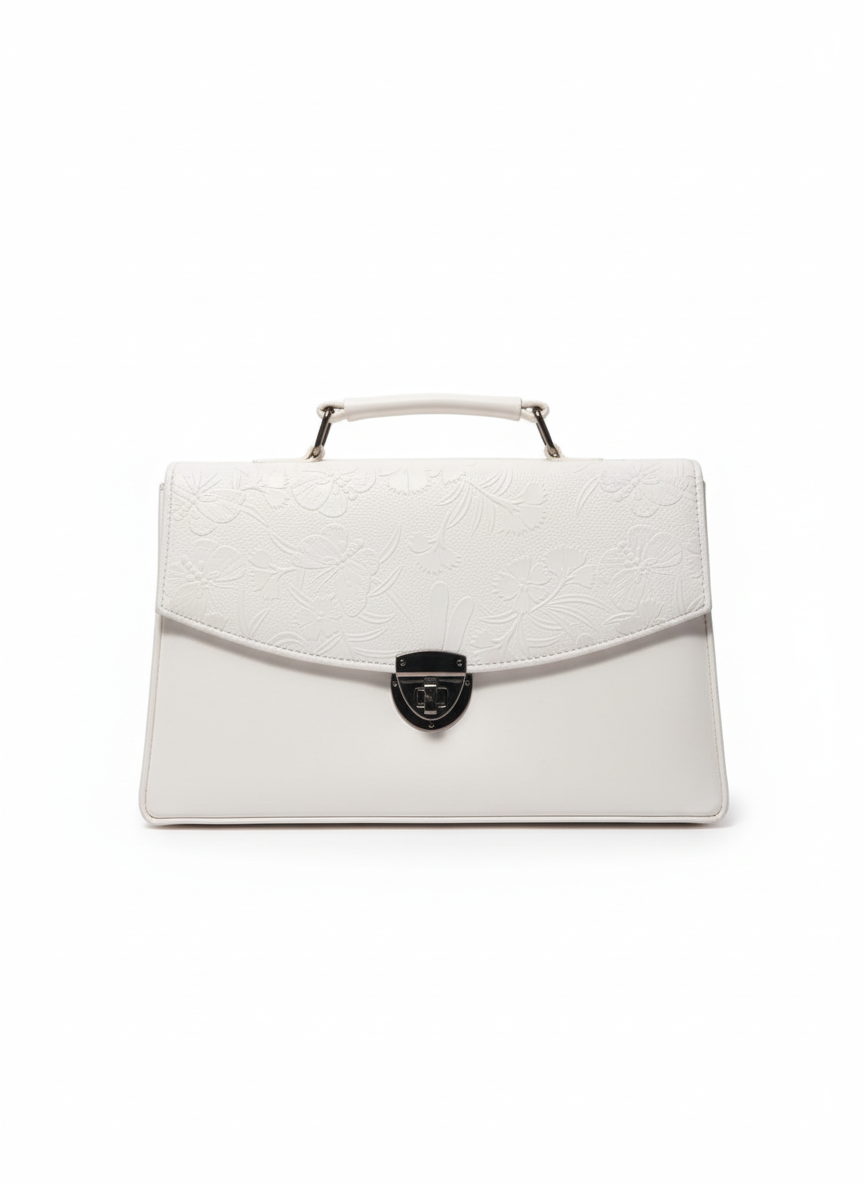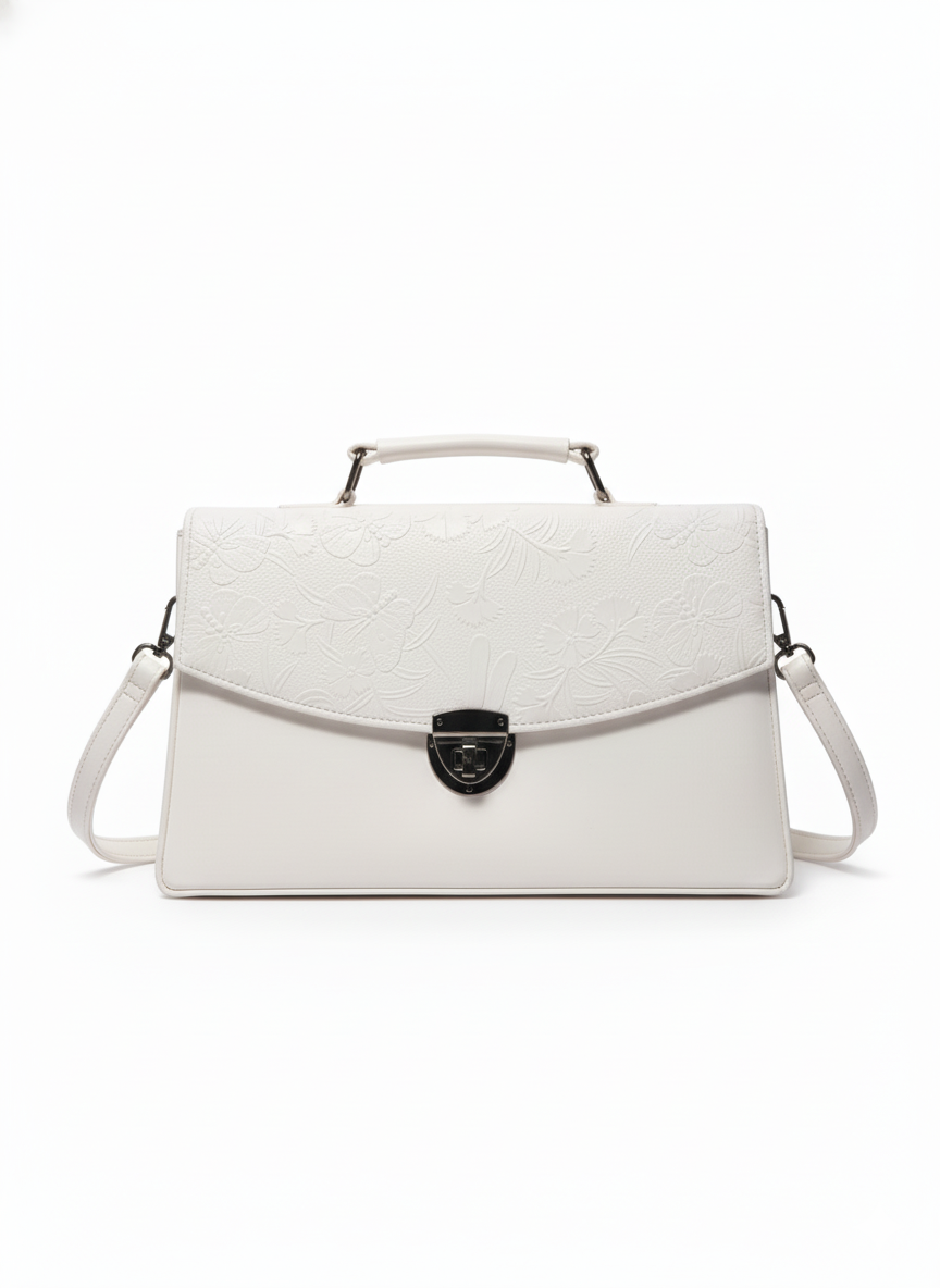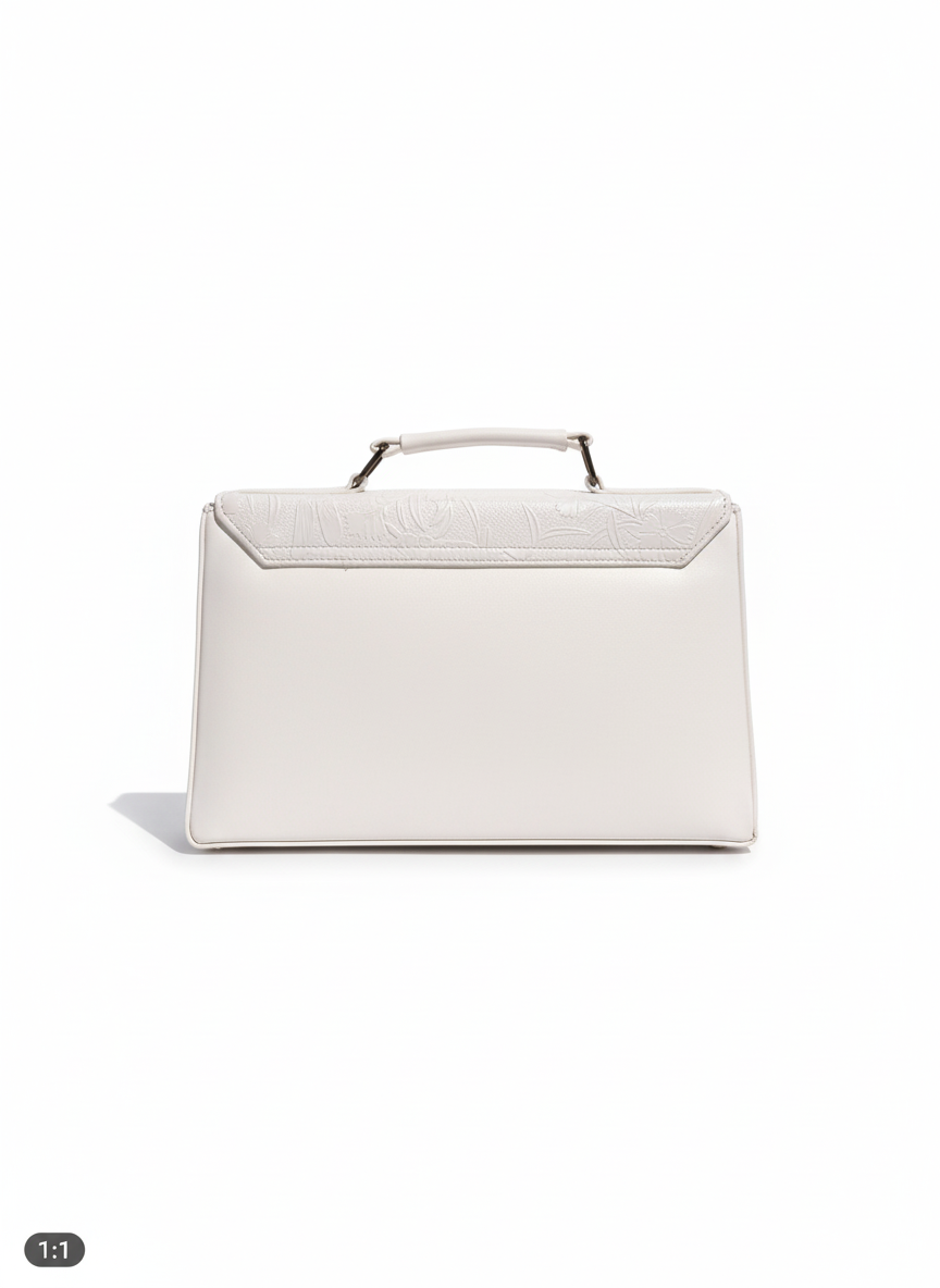 Meet the Satchel — a timeless statement of grace and sophistication. Crafted from premium embossed rexin with delicate floral detailing, this structured bag blends luxury and practicality effortlessly. Its clean design, secure lock closure, and refined texture make it ideal for both formal and casual settings. The soft beige tone adds a touch of understated elegance, while the sturdy top handle ensures comfort with style.